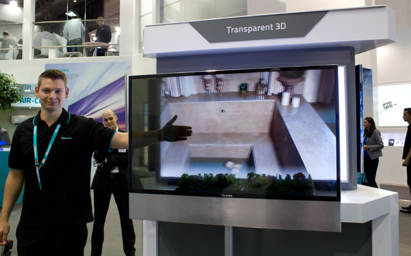 Naast een bril-vrije 3D tv toonde Hisense ook een transparante lcd tv met 3D weergave. De tv maakt gebruik van de passieve 3D-techniek waarvoor ook nog gewoon een brilletje opgezet moet worden. Het unieke is echter het transparante display waar je dus doorheen kunt kijken. Hoewel de toepassingen hiervoor niet helemaal duidelijk zijn is het effect wel leuk. De 3D-ervaring is door het transparante display iets minder, wat overigens ook kan komen doordat je niet alleen op het beeld focust maar ook wat zich daarachter bevindt, maar het laat in ieder geval zien wat de toekomst voor ons in petto heeft.
