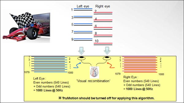 Volgens LG maakt de combinatie van deze twee beelden een Full HD 3D (1080p) beeld. De beeldkwaliteit wordt volgens LG niet aangetast door deze update, maar je moet de TruMotion optie wel uitzetten om de Full HD 3D weergave mogelijk te maken. Wij vragen ons af of het echt geen negatief effect op een ander vlak heeft. We zullen het moeten ondervinden, maar de kans bestaat dat het aantal artifacts rondom bewegende objecten hierdoor toeneemt.