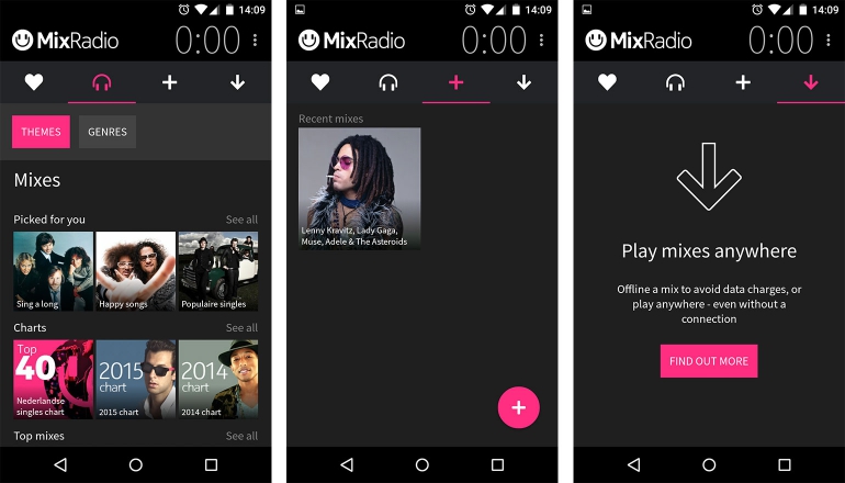Helaas beschikt MixRadio niet over een Cast-functie, waardoor je de nummers niet kunt streamen over je netwerk. Ook is er geen desktopapplicatie beschikbaar en zul je het dus altijd moeten doen met de mobiele variant. Dat laatste is geen groot probleem, want die mobiele app werkt heel fijn en is heel overzichtelijk. Je hebt vier tabs: direct beginnen met streamen, mixen uitkiezen, zelfs mixen maken en mixen downloaden.