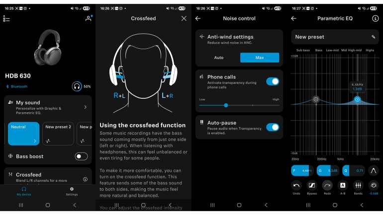 Net zoals bij heel wat andere Sennheiser-producten gebruik je de Smart Control Plus-app met de HDB 630. Wat je in deze app ziet verschijnen qua instellingen verschilt van product tot product. Bij deze hoofdtelefoon tonen er vooral veel mogelijkheden om de klank naar eigen smaak aan te passen. Los van een reeks geluidspresets die Sennheiser voorziet, kun je ook een Sound Check op je oren loslaten om een eigen preset te creëren. Het gaat hier niet om een traditionele gehoortest zoals sommige andere fabrikanten (zoals Teufel en JBL) aanbieden, maar om een reeks vergelijkingen die je helpen om je eigen voorkeuren te identificeren. Om Sound Check in te stellen, speel je een nummer af dat je goed kent. In een vijftal stappen krijg je telkens drie lichtjes andere tunings te horen. Je kiest in elk stap je favoriet, waardoor je op het einde een equalizerpreset krijgt die de zaken die je belangrijk vindt versterkt of net bepaalde frequenties wat minder hard zet. Het is in elk geval leuker dan luisteren naar pieptonen en levert een goed resultaat op. Wie het liever handmatig aanpakt, kan ook aan de slag met een parametrische equalizer.