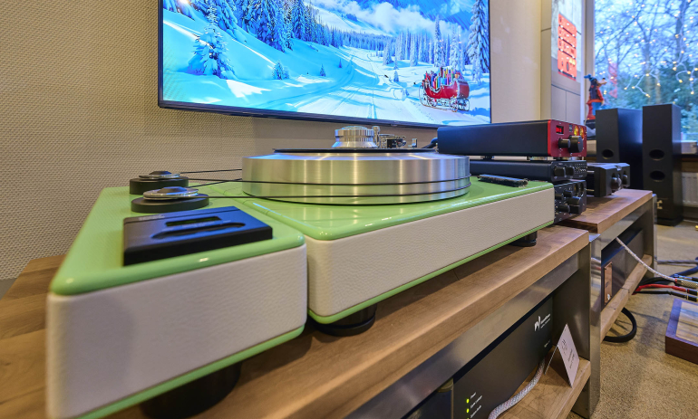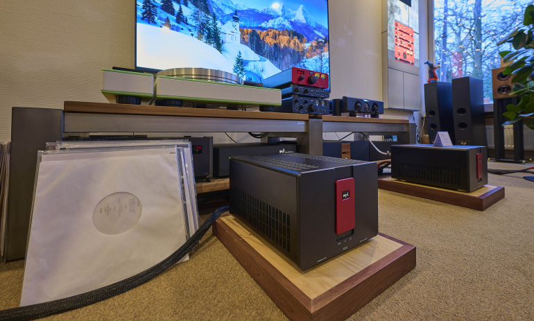 De visueel werkelijk prachtige draaitafel in deze setting is de EAT Forte in speciale leereditie. Het witte leer, in samenspel met de glanzend pastel-mintgroene kleur van de boven- en onderpanelen, vormt samen met het blanke metaal van plateau, arm en motoronderdelen een heerlijk spanningsveld. Een Shelter 901 III MC-element maakt deze analoge setting compleet. Verder zie ik een Haandrikman Sygnus X-1 lichtnetfilter/scheidingstransformator, een AudioPhool Music Server 2.1 en een Chord Electronics Ultima Integrated versterker. Tijdens mijn bezoek wordt gebruikgemaakt van SPL-componenten in de vorm van de VOLTAiR DAC/voorversterker, de VOLTAiR phono-voorversterker en de Performer M1000 mono-eindversterkers. Een krachtpatser die 420 watt aan 8 ohm en 750 watt aan 4 ohm levert en door het Duitse LowBeats zelfs tot referentie-eindversterker is verkozen.