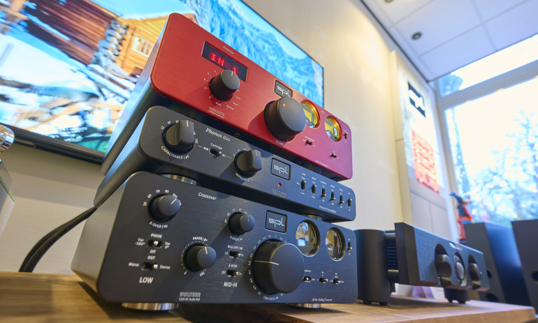 Dat laat ik mij geen twee keer zeggen en nieuwsgierig kijk ik rond. De grote ruimte waarin ik mij bij binnenkomst bevind, is voorzien van een royale hoekbank met daarvoor pontificaal de eerdergenoemde Final elektrostaten, aangestuurd door de top van het in Nederland relatief onbekende SPL. SPL staat voor Sound Performance Lab en is een Duitse fabrikant van hoogwaardige audioapparatuur met diepe wortels in de professionele studiowereld. Het bedrijf werd begin jaren tachtig opgericht en staat bekend om zijn eigenzinnige, technisch gedreven ontwerpen, waarbij luisteren belangrijker is dan het volgen van conventionele ontwerprichtlijnen. Kenmerkend zijn de robuuste bouwkwaliteit, productie in Duitsland en de eigen 120V VOLTAiR-technologie, die zorgt voor een moeiteloze dynamische presentatie, lage vervorming en een krachtige, transparante weergave.