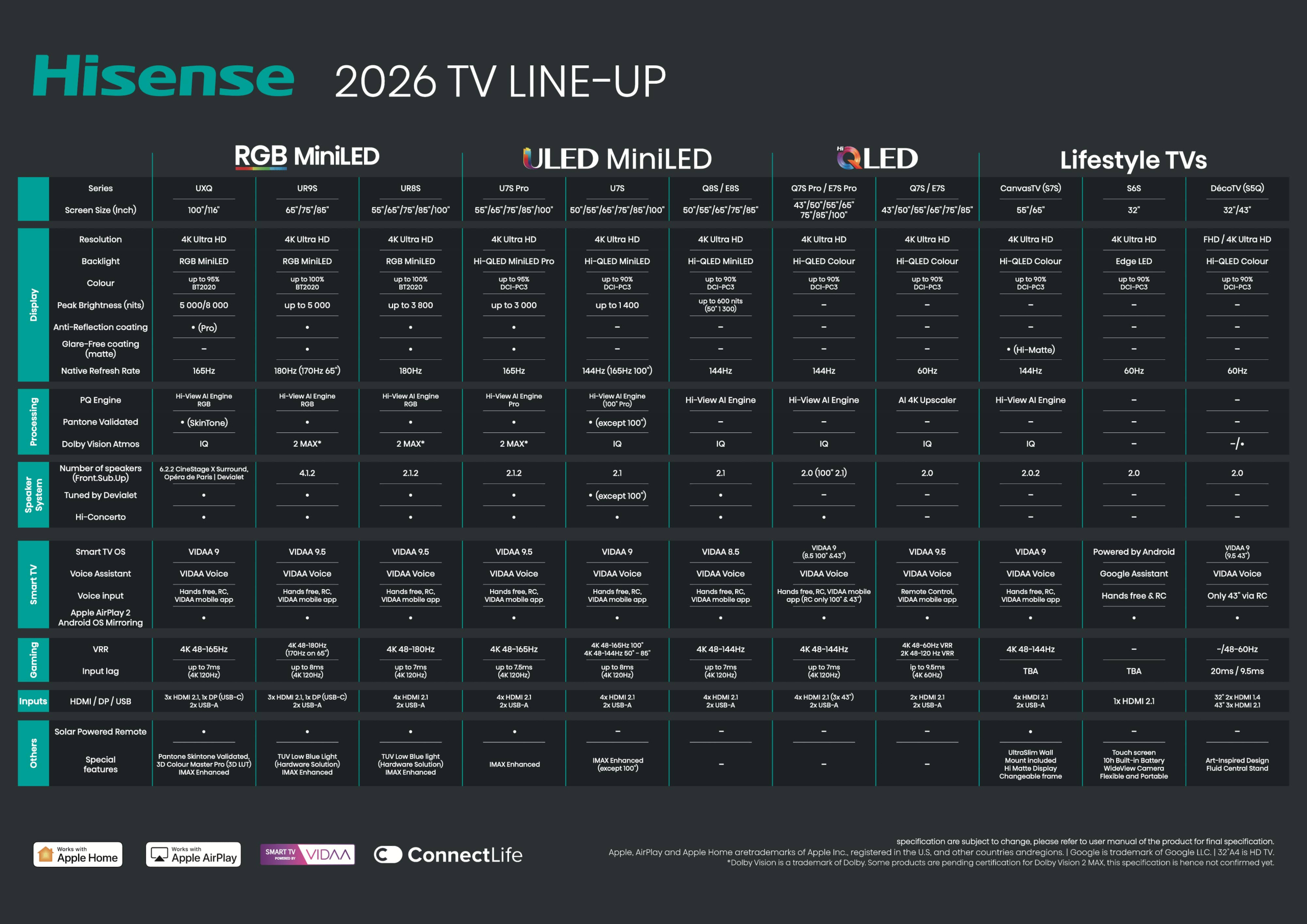Hisense breidt het aanbod van zeer grote schermen (100 inch en groter) uit naar verschillende prijssegmenten. Naast het vlaggenschip UXG (beschikbaar in 100 en 116 inch), verschijnen er 100-inch varianten in de UR8S, U7S (Pro) en E7S Pro series. De UR8S 100-inch beschikt over een native 180Hz VRR-paneel, terwijl de U7S-modellen gebruikmaken van de HI-QLED MiniLED-techniek.