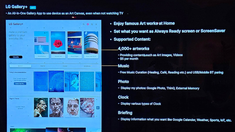 De opmars van AI en specifiek het gebruik van Large Language Models (LLM) is niet meer te stoppen. Voor het interpreteren van je stemcommando’s steunt LG nu op Google Gemini en Microsoft Copilot. Hiermee kunnen gebruikers nu ook complexe vragen stellen die niet direct met TV-content te maken hebben, zoals het plannen van een reis. Gebruikers kunnen inloggen op hun persoonlijke profiel via stemherkenning (Voice ID). Met generatieve AI kan je nu niet alleen beelden maken, je kan ze ook bewerken waarbij je bijvoorbeeld de achtergrond van een eigen foto kan aanpassen. Daarnaast kan je nu ook AI-muziek genereren. Die opties zitten evenwel achter een betaalmuur. LG biedt nu ook een kunstgalerij aan, net als Samsung. LG Gallery+ (5 USD/maand) biedt toegang tot meer dan 4000 kunstwerken, en een aantal maandelijkse credits voor AI generatie.