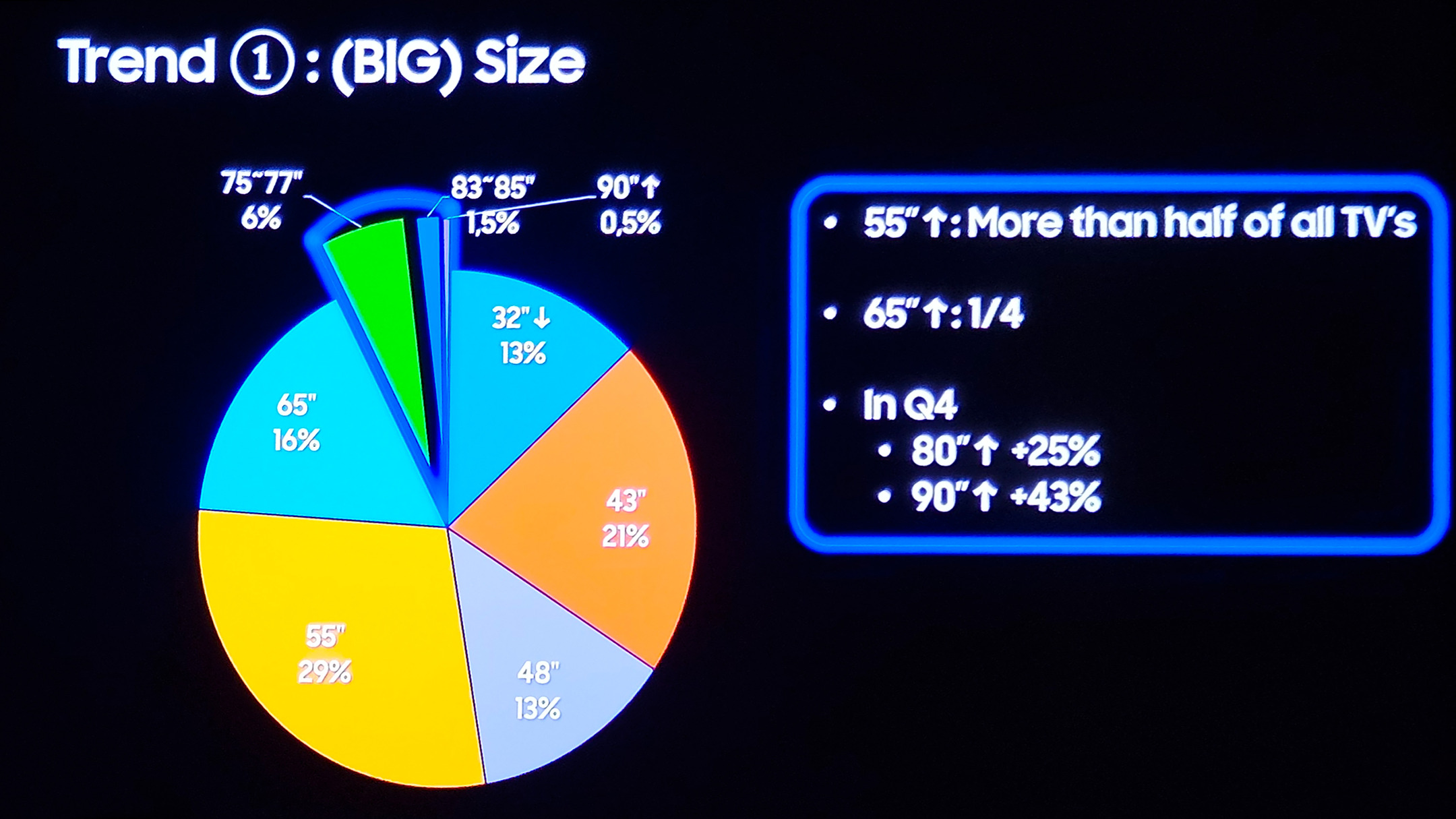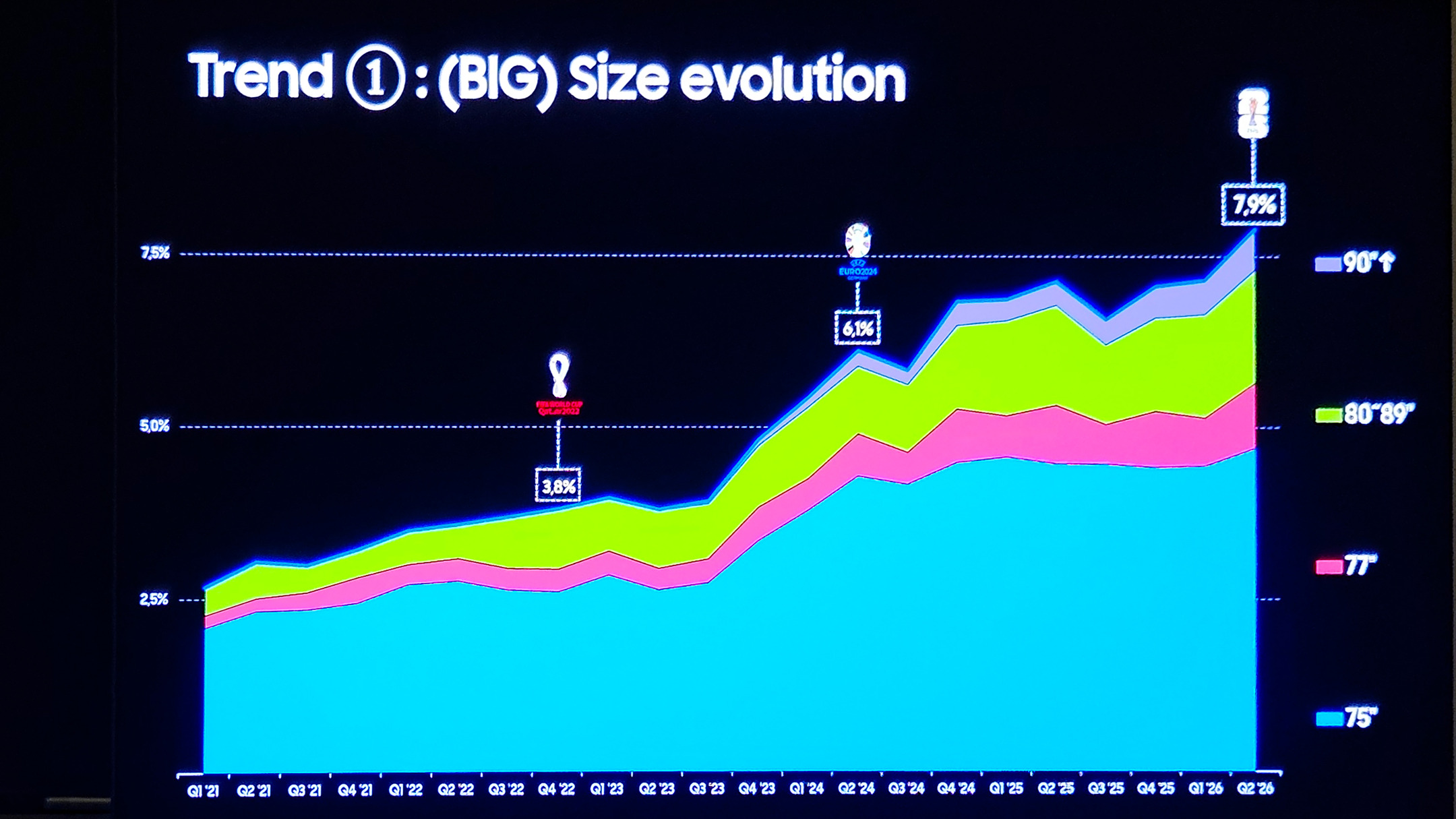 Samsung startte het persevent met een algemene presentatie, en daar willen we toch een paar opvallende cijfers uit meegeven. Grote schermformaten zitten duidelijk in de lift. Zo ziet Samsung dat 55 inch en groter al meer dan de helft van de tv’s vertegenwoordigt, en 65 inch en groter is goed voor een kwart van alle tv’s. Zelfs 75 inch en groter zijn al goed voor 8% van de markt. En die erg grote maten zien een sterke groei. Sinds 2021 zijn ze van 2,5% van de markt gestegen naar 8% van de markt, met een duidelijke versterking van de groei sinds 2023.