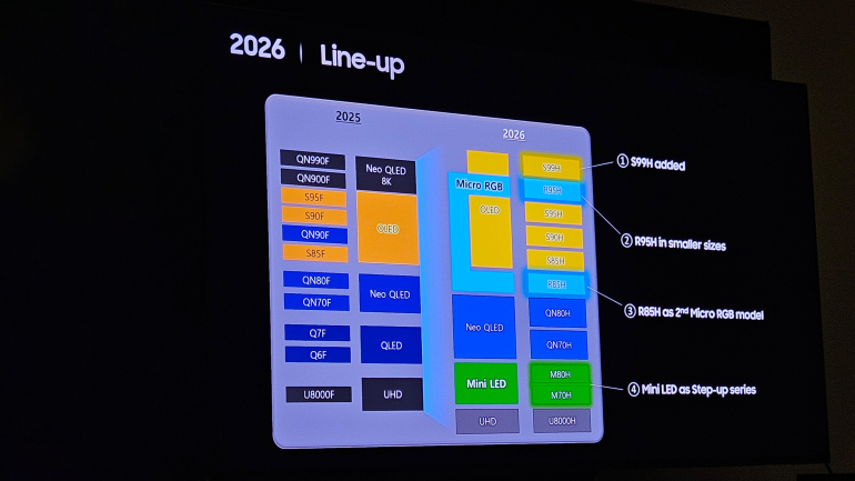 Wat zijn de grote lijnen van de nieuwe line-up? Samsung heeft de strijd voor 8K opgegeven, er blijft nog een model beschikbaar, maar het is duidelijk dat er geen focus meer is op 8K als top van het aanbod. De belangrijkste nieuwkomers zijn de S99H, en de Micro RGB R95H en R85H. Het QLED-aanbod kreeg een upgrade en bijhorende nieuwe naam Mini LED.