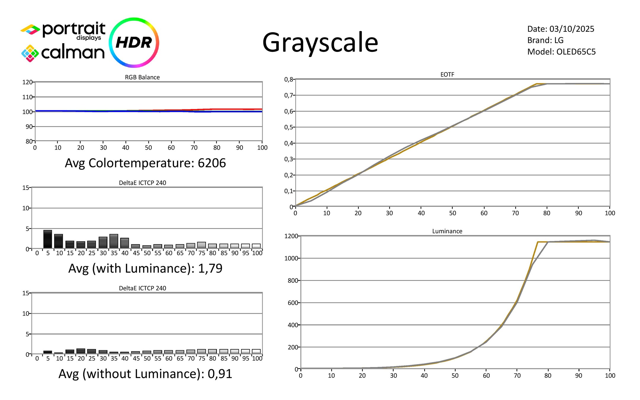 Van het OLED evo-paneel moet je misschien geen gloednieuwe records verwachten, maar LG C-reeks heeft altijd mooie cijfers neergezet. Zo ook dit jaar. Op het 10%-venster meten we een piekhelderheid van 1214 nits waaruit blijkt dat LG nog 20% extra uit het paneel heeft weten halen ten opzichte van de C4. Op het volledig wit is de piekhelderheid 195 nits, dat is nagenoeg hetzelfde als op de C4. Ja, we zouden die piekhelderheid op het volledig wit beeld graag hoger zien, zoals dat op de G5 het geval was, omdat de Average Brightness Limiter dan minder moet ingrijpen. Maar met de huidige resultaten blijft de C5 toch duidelijk in de kop van het peloton in zijn categorie.