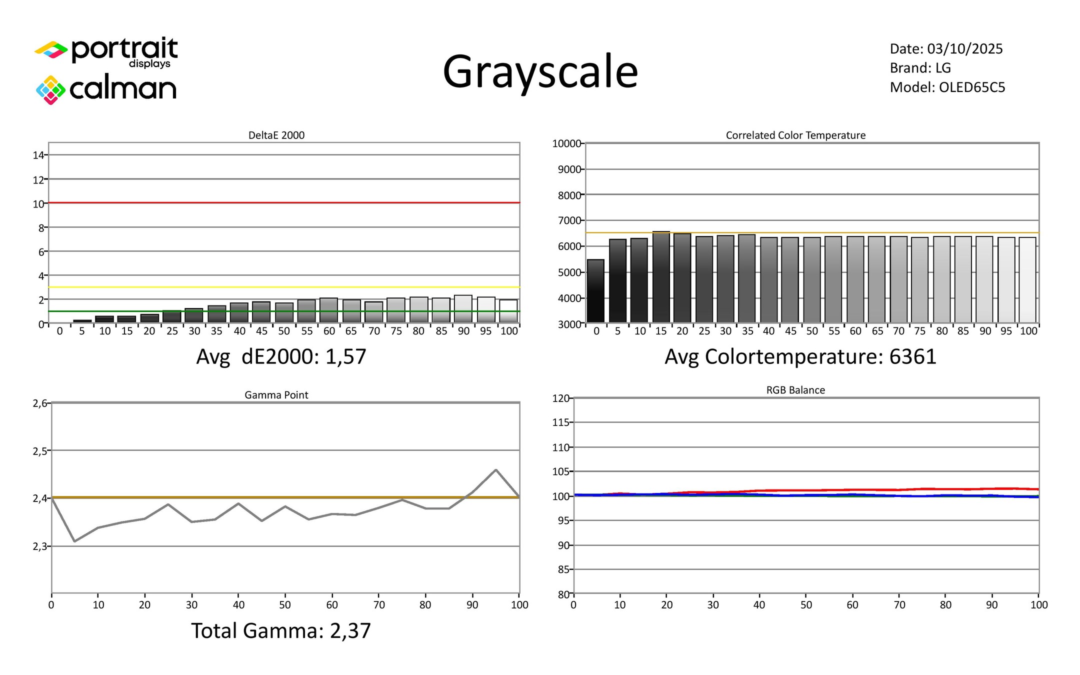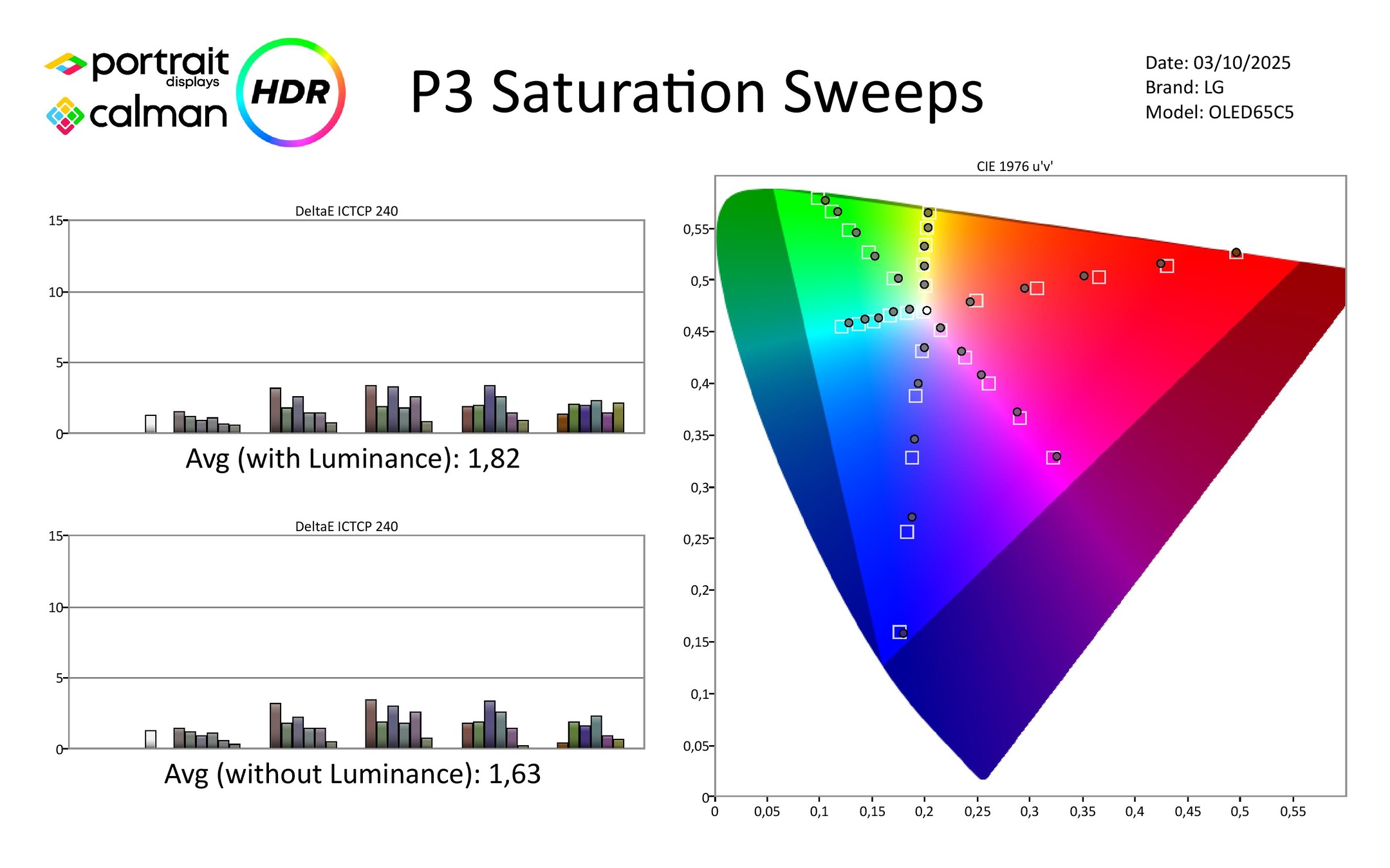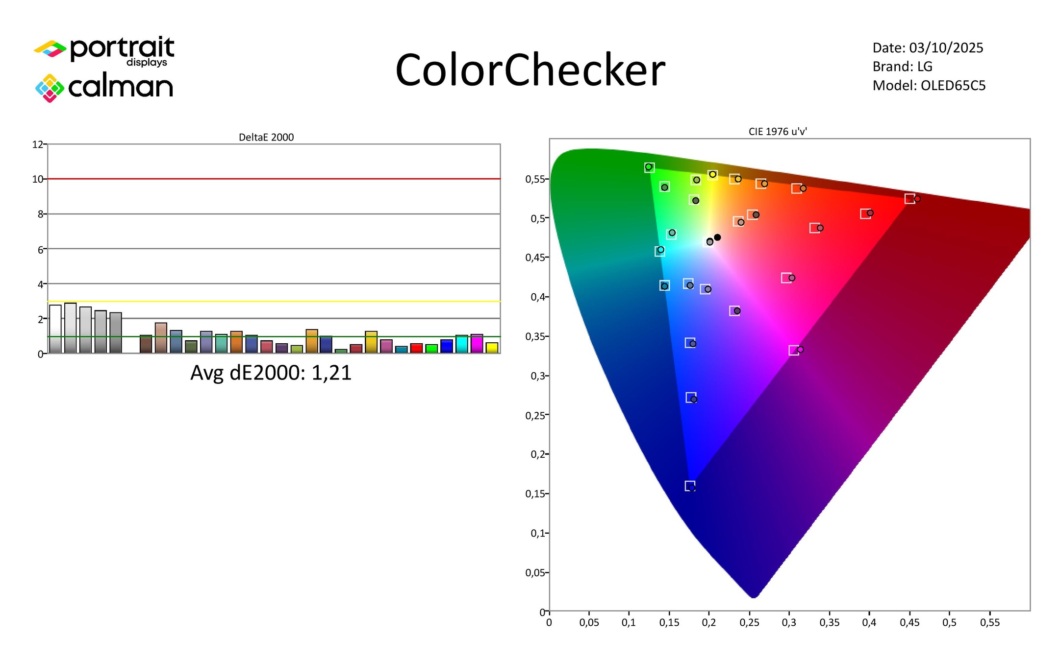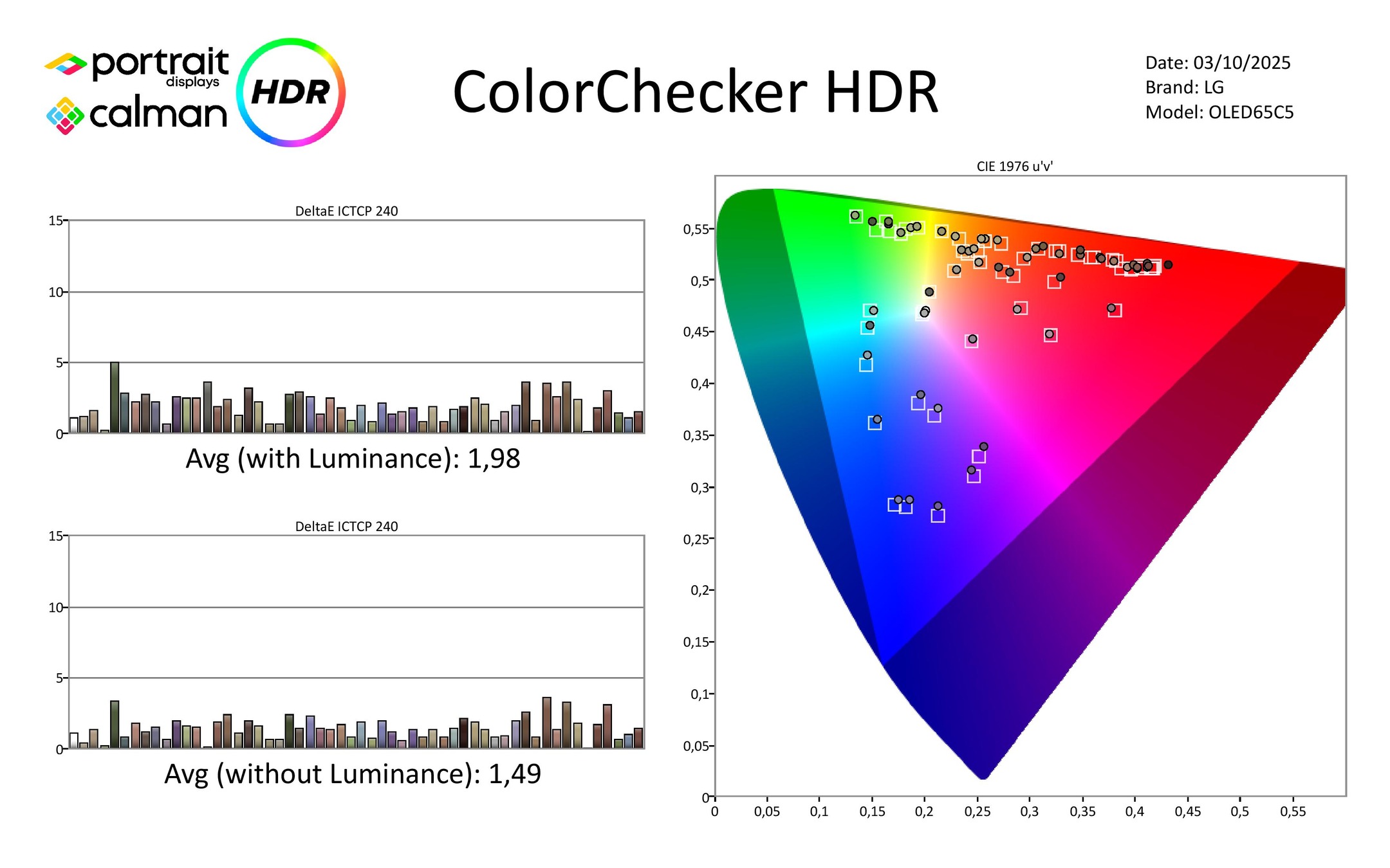 Het kleurbereik is zeer goed, daar zien we 72% Rec2020 en 98.6% P3. LG ondersteunt HDR10, HLG en Dolby Vision IQ, helaas nog steeds geen HDR10+. Hij lijkt in elk geval uitstekend uitgerust voor HDR.