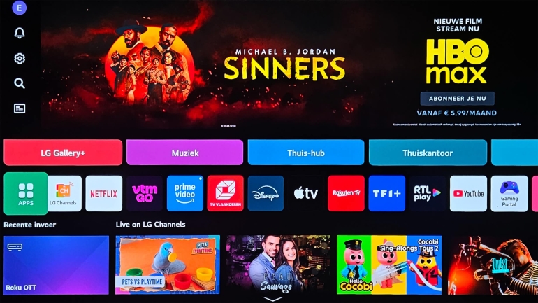 Smart tv: De C5 gebruikt webOS 25, voor meer info kijk je in ons artikel over webOS 24. Daar vind je ook hoe je de vervelende reclame uitschakelt die LG nog steeds standaard voorschotelt. De nieuwe AI-functies blijken nog steeds nauwelijks meerwaarde te bieden. Zo werkt Voice ID niet in het Nederlands, is de chatbot naar ons gevoel erg beperkt en blijft het concept van een AI-concierge bijzonder beperkt. Wat is er dan wel verbeterd? De zoekfunctie reikt nu resultaten aan uit verschillende streamingdiensten. Je kan live tv en HDMI-ingangen mee in de lijst van favoriete apps plaatsen. En om het Home-scherm te personaliseren kan je apps en Quick Cards die je niet gebruikt verbergen.
