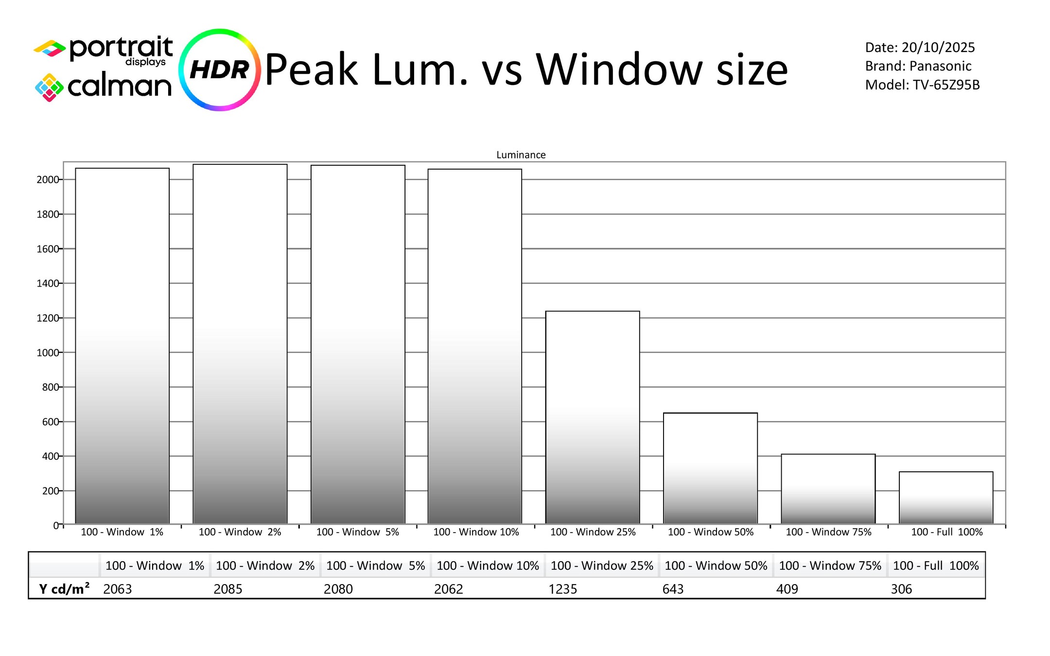 Panasonic legt altijd nadruk op de extra koeling die ze voorzien op hun OLED-paneel, maar dat heeft dit jaar niet tot nieuwe records geleid. Het 10%-venster levert 2075 nits, op het volledig wit scherm zien we 311 nits. Bijzonder mooie resultaten, maar dus een tikje onder de LG G5 (2400/350) of de Philips OLED950 (2200/375). Het blijven wel zeer goede resultaten. Daartegenover staat dat de Panasonic wel guller is op het 25%-venster waar hij met 1200 nits 20% boven de concurrenten zit. We benadrukken nog eens dat 311 nits op een volledig wit beeld erg goed is, en het ingrijpen van de Average Brightness Limiter veel minder noodzakelijk maakt. Dat maakt dat de zichtbare helderheid op het scherm minder fluctueert.