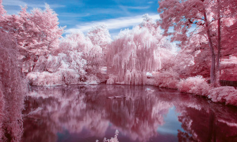 Feeërieke witten en verrassende contrasten bij zwartwit. Suikerachtige en valse tinten bij kleur. Dat is de creatieve wondere wereld van Infrarood (IR). Je kunt zowel in IR fotograferen als video’s maken. Een kwestie van de juiste IR- filters bij analoge filmemulsies of digitale sensoren. Geheel digitaal kan eveneens bij de nabewerking voor een IR-look van het foto- of videomateriaal met behulp van een LUT of kanaalmixer.