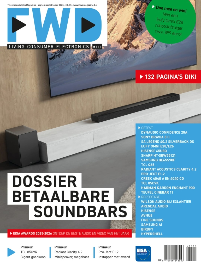 Naast soundbars staan luidsprekers echt in de kijker in dit nummer van FWD Magazine. Een uitgebreide review van de spectaculaire actieve Dynaudio Confidence 20A is niet te missen als je op zoek bent naar een echte high-end oplossing die geen stapel andere apparaten vereist. De Clarity 4.2 van Radiant Acoustics is iets heel anders: deze minispeaker zet drie baanbrekende woofers in om onwaarschijnlijk kamervullend te spelen. Of zoek je een gebruiksvriendelijke draadloze hifi-speakerset met een grote scheut Scandi-design? Dan is de test van de System Audio Legend 40.2 Silverback DS de moeite waard om door te nemen. Betaalbare audio komt ook aan bod, met een primeurreview van de Pro-Ject E1-draaitafel en een mooi systeem van Creek Audio.