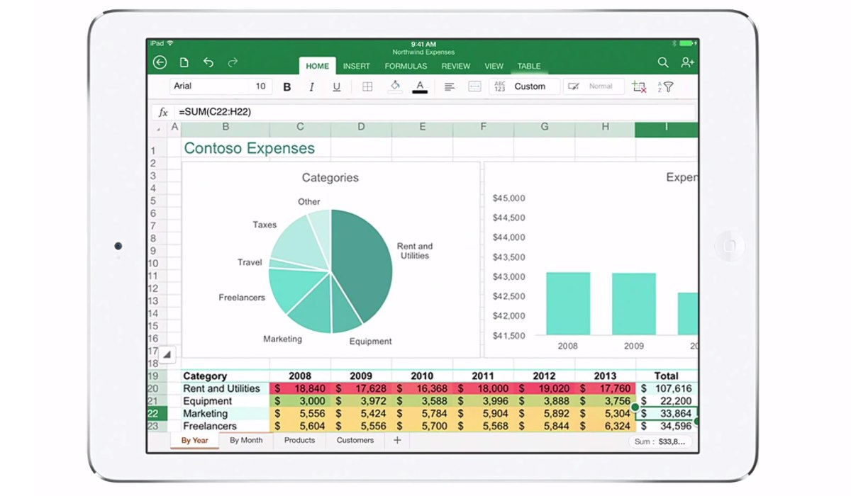 Qua uiterlijk houdt Microsoft vast aan het uiterlijk van Office op andere platformen, al geeft het bedrijf uit Redmond wel aan de apps compleet nieuw ontwikkeld te hebben. Microsoft wil één en dezelfde ervaring op alle platformen bieden zodat een Word-document dat je op je Windows-apparaat bekijkt er hetzelfde uitziet op je iPad. De kenmerkende blauwe kleur zien we dus ook in de iPad-app terug, net als de werkbalk met alle opties voor het bewerken van documenten en presentaties. De interface is compleet geoptimaliseerd voor touch. De iPad-versie van Office biedt, dankzij het grotere formaat, meer opties dan de iPhone-versie.