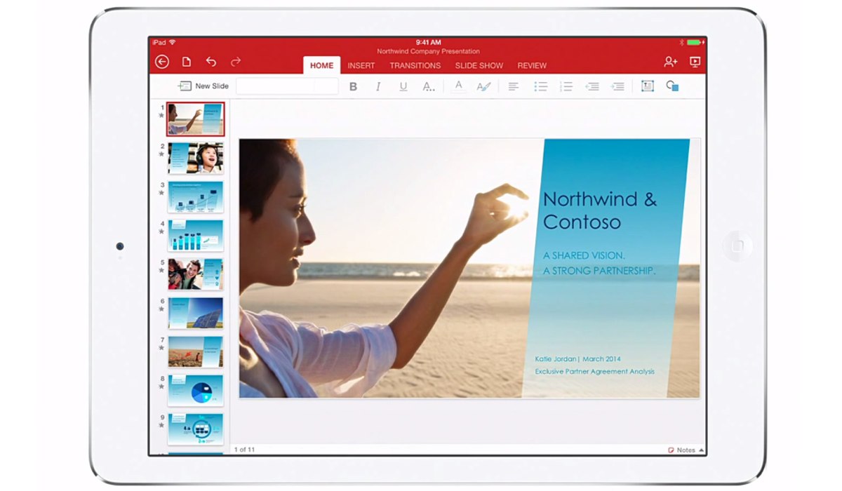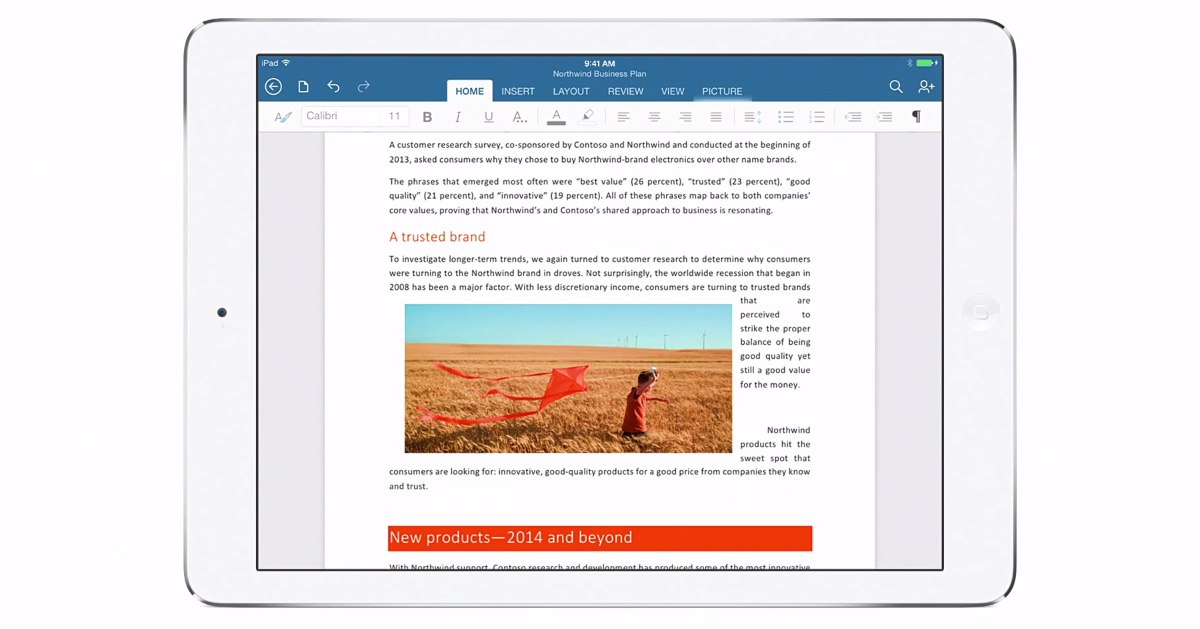 Office voor de iPad bestaat uit Word voor het bewerken van documenten, PowerPoint voor het bewerken van presentaties en Excel voor het bewerken van spreadsheets. De applicaties zijn vanaf nu gratis te downloaden; Word, Excel en PowerPoint.