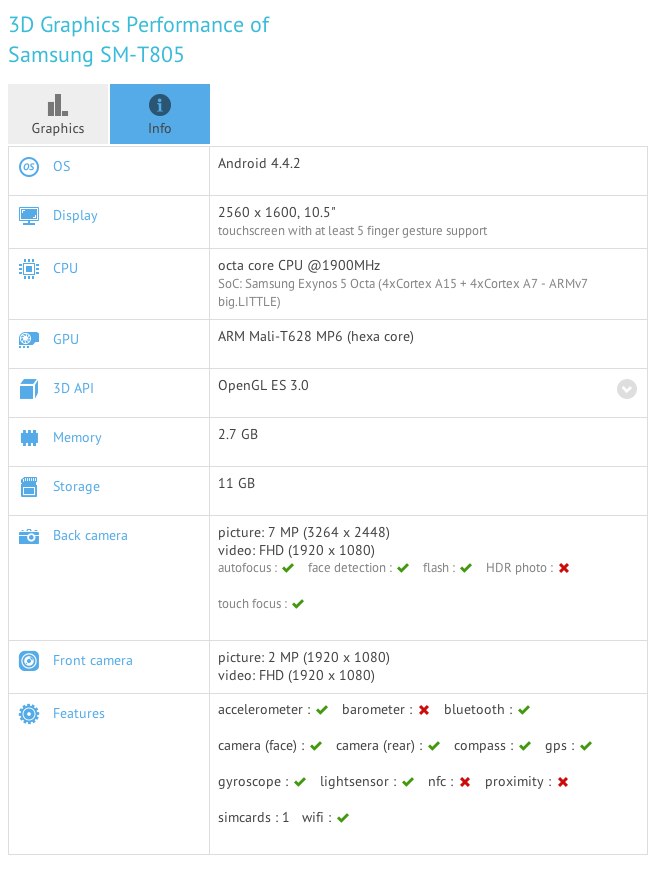 Maar, mogelijk is de amoled-variant van de Galaxy TabPRO 8.4 niet de enige tablet met amoled-display die we van Samsung gaan zien. Er gaan namelijk ook al een tijdje geruchten over een 10-inch versie die het modelnummer SM-T80x zou dragen. Ook dit model lijkt te bestaan want vanmorgen kwamen we in dezelfde benchmark database de SM-T805 tegen.