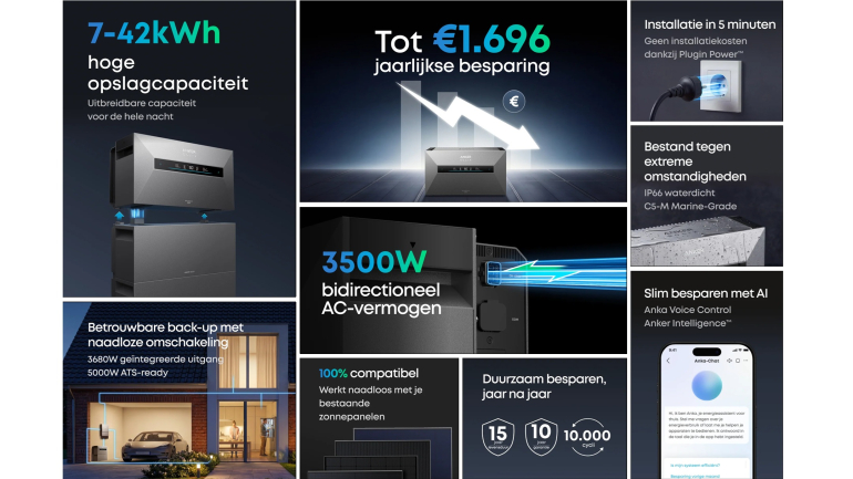 De nieuwe thuisbatterij beschikt over een 3.500 W bidirectionele omvormer en een capaciteit van 7 kWh. Het systeem is uit te breiden tot 42 kWh met optioneel verkrijgbare uitbreidingsbatterijen. Volgens Anker SOLIX is deze thuisbatterij compatibel met vrijwel alle gangbare zonne-energiesystemen en kan je het makkelijk toevoegen aan bestaande installaties. Door de bidirectionele omvormer met een maximumvermogen van 3.500W kun je de overdag opgeslagen stroom in de nacht weer gebruiken voor je wasmachine, keukenapparatuur, warmtepompen of bijvoorbeeld EV-laders. Onder optimale omstandigheden verdien je dit model volgens Anker SOLIX in drieënhalf jaar weer terug. Via de app krijg je inzicht in je besparingen en kun je het systeem bedienen. Anker Intelligence zorgt ervoor dat er automatisch wordt opgeladen en ontladen op de meest voordelige momenten bij gebruik van een dynamisch energiecontract.