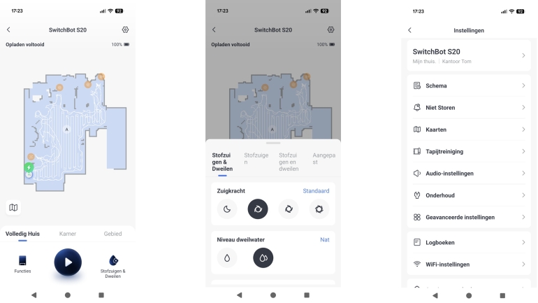 De SwitchBot-app is verder niet veranderd en de robotstofzuigeromgeving is vrijwel identiek aan de voorganger. De vertaling laat wederom hier en daar te wensen over, maar over het algemeen is alles duidelijk te vinden. Je kunt een huis aanmaken, kamers toewijzen en natuurlijk selecteren hoe en waar er schoongemaakt moet worden. Kies de zuigkracht, de hoeveelheid water bij het dweilen of bijvoorbeeld het gedrag op tapijten (zuigkracht vergroten) of een kinderslot. Nieuw is AI-herkenning, waarbij de camera gebruikt wordt om een AI-gestuurde kaart te maken van het huis. Dit vergt nog wel even wat werk, want de trap werd gezien als speelgoed en het fitnessapparaat op zolder was ineens tapijt. Bedrading wordt wel goed gezien overigens. We hebben de AI-herkenning daarna maar uitgezet. Een ander probleem wat makkelijk opgelost kan worden in de app is de mogelijkheid Stofzuigen & dweilen. Deze staat er namelijk twee keer in. Bij de ene mogelijkheid doet de SwitchBot S20 stofzuigen en dweilen in dezelfde schoonmaakronde. Bij de andere mogelijkheid wordt er eerst een ronde stofzuigen gedaan en is dat klaar? Dan wordt er een ronde gedweild. Een duidelijk verschil, maar in de app staat precies hetzelfde. Een slordigheidsfoutje dit. De app werkt verder prima en is, afgezien van de soms wat gebrekkige vertaling, voor iedereen duidelijk genoeg.