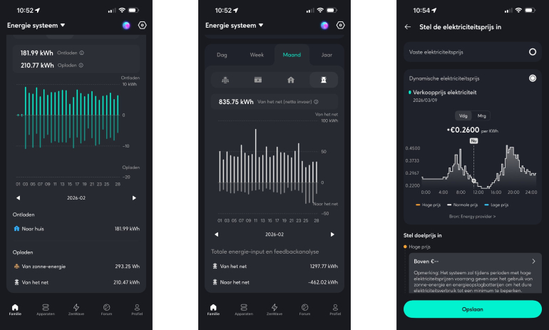 Voor gebruikers met een dynamisch energiecontract (zoals Tibber of Zonneplan) is de integratie verbeterd. Het systeem koppelt direct met de tarieven van meer dan 840 Europese aanbieders. De AI kan nu besluiten de accu te laden wanneer de prijzen laag of negatief zijn, ongeacht de opbrengst van de zon. En deze functie werkt nagenoeg perfect. De accu’s beginnen automatisch met laden bij lagere prijzen en ontladen juist bij hogere prijzen. Daarbij wordt de opbrengst van de zon (eigen panelen) niet vergeten, dat heeft altijd voorrang.