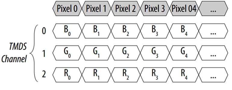Dat is het geval voor RGB codering. Indien het signaal verzonden wordt als YCbCr dan zal de gekozen chroma subsampling tot lichtjes andere transmissieschema’s leiden (die vind je hier, op p15 tot 17).