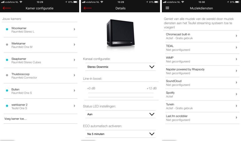 De Teufel multiroom-speakers zijn actieve speakers die met elkaar kunnen communiceren via WiFi, aangestuurd worden middels een Teufel controller-app (gratis te downloaden) en in principe alleen middels een stroomkabel met de muur verbonden hoeven te worden. Vanuit de app heb je toegang tot onder meer Spotify (Connect), Tune-in Radio, je eigen opgeslagen muziek, Tidal, Napster, WiMP, Last.FM, SoundCloud en apparatuur die aangesloten is op de line-in aansluiting. Ook is er een usb 2.0-poort en een ethernetpoort voor bekabelde verbinding aanwezig. Helaas is de ondersteuning van Google Cast dit jaar uit de speakers verdwenen en ook zien we Apple Music nog altijd niet terug.