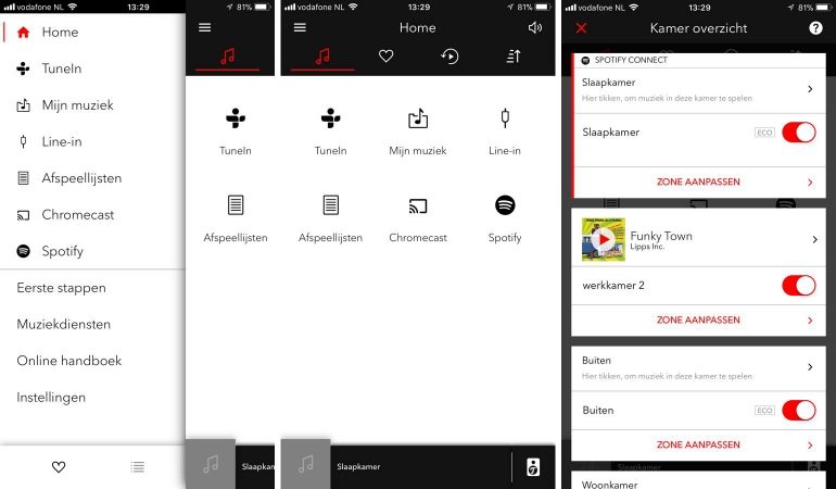 De applicatie biedt verder nog diverse functies en opties. Zo kun je bepaalde radiozenders als favoriet instellen, houdt de app zelf bij wat je vaak draait en wordt daar een lijst van gemaakt, kun je zenders of nummers in de wachtrij zetten en heb je de mogelijkheid om je geschiedenis van afgespeelde bronnen te bekijken. Bij de instellingen kun je extra speakers aan een ruimte/kamer toevoegen, namen van speakers wijzigen, de status-leds in- of uitschakelen en het aantal decibel waarmee de line-input verhoogd moet worden instellen.