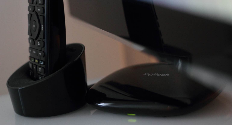 Daar heeft Logitech iets op gevonden, de Logitech Hub. De Logitech hub is een klein zwart kastje dat niet alleen infrarood, maar ook andere signalen kan herkennen en kan overbrengen naar de afstandsbediening. Hierdoor is het mogelijk om met de universele afstandsbediening ook apparaten te bedienen die je voorheen niet kon gebruiken, waaronder gameconsoles, maar ook verlichting van Philips Hue of thermostaten van Nest. Ook Amazon Echo is te gebruiken in combinatie met de hub, zodat je de televisie aan kunt zetten via stembediening. De hub maakt het ook mogelijk om de smartphone te gebruiken als universal remote. Zo kun je voordat je thuis komt al de thermostaat een graadje warmer zetten of de verlichting alvast aan zetten.