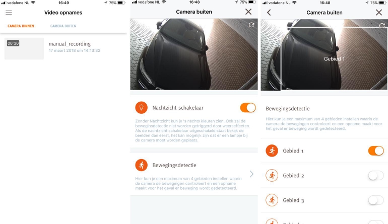 In de gebruiksvriendelijke app heb je vanuit het homescreen meteen toegang tot de twee camera’s. Schuif ze naar boven en je kunt direct de live-weergave van beide camera’s bekijken en wanneer nodig een opname starten. In het menu bevindt zich daarnaast de optie ‘video opnames’. Hier vind je alle opnamen die je zelf gestart hebt en de opnamen die door de camera gemaakt zijn. De app werkt soepel en snel, zonder bugs of fouten, maar in de weergave van opnamen ontbreken bij ons de thumbnails. Dit maakt het terugzoeken van een opname wel een stuk lastiger, zeker wanneer je na een nacht 100 opnamen hebt. Vanuit het overzicht van opnamen kun je elk fragment bekijken, maar er is voor de app nog geen mogelijkheid om een fragment te downloaden. Dit kan alleen in de browser. Hopelijk verschijnt deze mogelijkheid in een toekomstige versie.