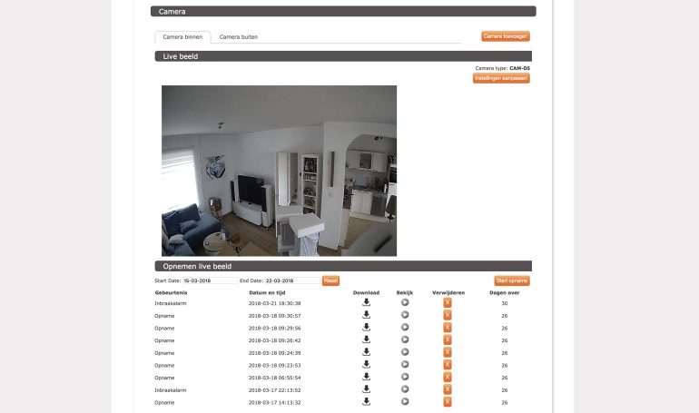 Maar, als je de HD Binnencamera en/of HD Buitencamera aanschaft dan is de Videobeveilingsdienst vereist. Dit abonnement kost vier euro per maand en komt bovenop de 8,95 euro van het standaard abonnement. Voor vier euro in de maand krijg je dan directe video-opnamen bij een alarm, de mogelijkheid om opnamen direct terug te kijken in de app of in de browser en een 30-dagen opslag voor alle opnamen. Overigens zijn alle opnamen te downloaden vanuit de browser.