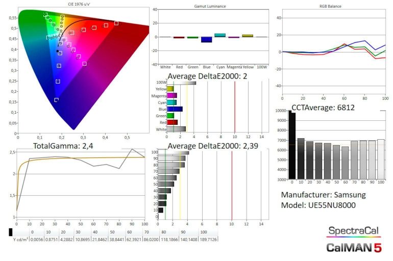 Het scherm heeft een goede uniformiteit. De kalibratie van de filmmode is goed, maar kan zeker beter. De grijsschaal kent in de helderste tinten een wat grillig verloop, vermoedelijk te wijten aan de local dimming (niet uitschakelbaar). De fouten zijn klein genoeg om nauwelijks op te vallen. De kleurtemperatuur is iets te koel in de heldere tinten (licht blayw-cyaan tint). De gamma waarde is vrij hoog (2,4), ideaal voor kijken bij verduistering maar iets te donker voor typisch huiskamergebruik. De kleurweergave is prima. De beelden zijn erg natuurlijk en dankzij het goede contrast heeft het beeld flink wat diepte.
