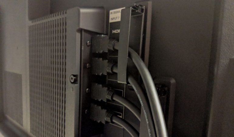 Hoe lever je 8K video aan? Met vier(!) HDMI-aansluitingen tegelijk, zo blijkt. Het toestel is nog niet uitgerust met HDMI 2.1 (de specificaties daarvoor werden pas begin dit jaar gefinaliseerd). Aangezien 8K een enorme bandbreedte vereist die HDMI 2.0 niet kan leveren (HDMI 2.0 is beperkt tot 18 Gbps en 8K vereist 32 tot 128 Gbps) was er dus een creatieve oplossing nodig. 8K wordt daarom aangeleverd via vier geaggregeerde HDMI-aansluitingen. Uiteraard heb je een speler nodig die dat ook biedt, en dat soort toestellen vind je enkel op de professionele markt (lees: een paar duizenden euros), wat opnieuw aangeeft dat dit toestel echt niet op de grote massa mikt.