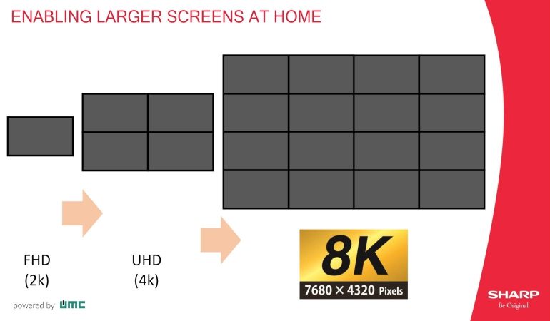 Een treffend beeld van Sharp illustreert hoe onze woonkamers geëvolueerd zijn (en hoe zij hopen dat die verder evolueren). Met de introductie van Full HD, was een 32 inch scherm “groot”, zij het nog niet enorm. Met 4K kunnen we vier dergelijke schermen bij elkaar zetten, goed voor een 64 inch diagonaal. Dat is de situatie vandaag, en die was bijna ondenkbaar 10 jaar geleden.