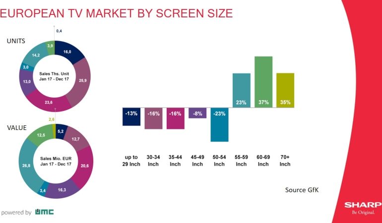 Wanneer we de markt van vorig jaar bekijken, merken we vooral dat maten van 30-44 inch nog steeds de helft van de verkochte aantallen is, maar dat hun aandeel wel slinkt. Zelfs 50-55 inch, goed voor 14% van de aantallen ziet zijn aandeel slinken, allemaal ten voordele van de grotere modellen. Grote schermen zitten dus in de lift, en vermits die over het algemeen ook duurder zijn, zullen fabrikanten dat maar al te graag zien.