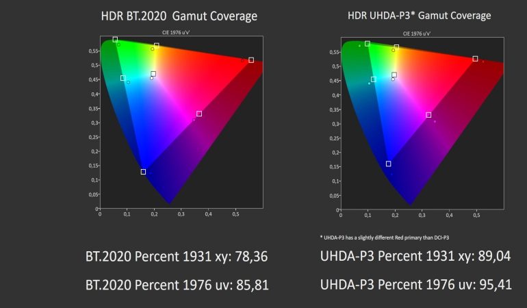 De X500E is voorzien van een ‘nieuwe’ technologie om een breder kleurpalet te genereren en dat liet zich merken tijdens de metingen. Met een dekking van 78% Rec.2020 is dit scherm de nieuwe leider op dat vlak. (zowel oled als qled leveren vandaag maximum ongeveer 71% Rec.2020). Omdat er gekozen is voor een groen dat zeer duidelijk in de richting van het echte Rec.2020 groen gaat, is de dekking van het P3-kleurbereik dan weer iets minder (89% ten opzichte van 97-99% voor oled en qled). Het was moeilijk om de impact daarvan op de huidige content in te schatten (die mikt vooral op P3). Maar het kleurbereik is dus wel degelijk groot genoeg om een goede HDR-weergave mogelijk te maken