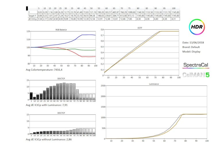 Op vlak van lichtopbrengst heeft de Sharp een specificatie van 1.000 nits en dat was tijdens de metingen makkelijk te bevestigen. In sommige omstandigheden ging de meter tot bijna 1.400 nits. De EOTF-curve wordt vrij goed gevolgd, maar zoals we wel bij meer fabrikanten zien is ook hier de helderheid te hoog. Het scherm clipt ook alle detail boven de 1000 nits weg, en in een test met andere metadata bleek de tv die metadata te negeren. Er is dus een risico dat content die op bijvoorbeeld 2.000 of 4.000 nits target gemastered is, wat witdetail zal verliezen.