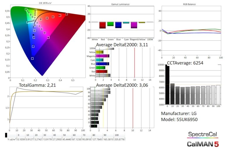 De kalibratie van de LG is wel degelijk. In de Bioscoop mode heb je een goede grijsschaal, die enkel in de lichtste tinten een fijne gele tint krijgt. De gamma-waarde is goed, maar de curve verbergt zoals gezegd wat zwartdetail. Uitstekende resultaten zien we bij de kleurweergave waar de LG wel mooi voor de dag kan komen zeker in heldere beelden. Het scherm levert in deze mode ongeveer 200 nits helderheid, dat is voldoende om bij normaal omgevingslicht te kijken.
