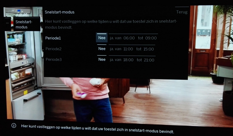 Een erg handige energiebesparende feature is de getimede snelstartmodus. Je kunt tot drie periodes specificeren waarin het toestel zich in snelstartmodus bevindt. Zo bespaar je op andere momenten van de dag energie, terwijl je bijvoorbeeld ’s avonds de tv snel kunt aan zetten.