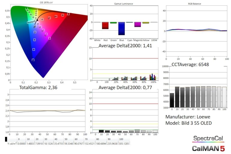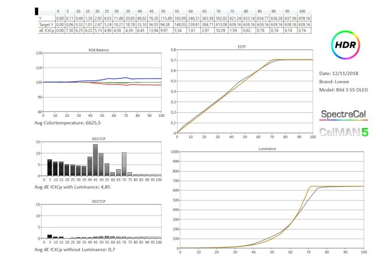De maximale piekluminantie van de Bild 3 komt uit op ongeveer 676 nits (op een 10% venster, bij 2% kan hij 783 nits halen). Na geruime tijd daalt de piekluminantie naar 130 nits. Op een volledig wit beeld haalt de Bild 3 een goede 151 nits, een zeer goed resultaat. Kleurprestaties zijn identiek aan andere OLED-modellen met een DCI-P3 bereik van 98% en Rec.2020 bereik van 71%.
