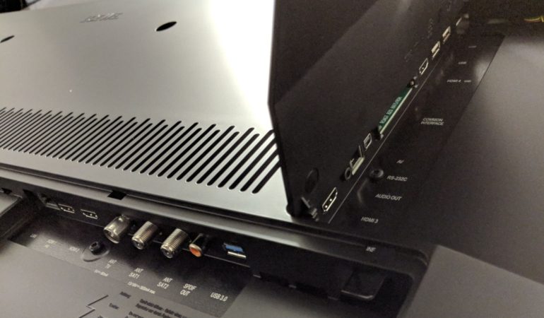 Het toestel is voorzien van vier HDMI-aansluitingen (twee achteraan en twee opzij), die allemaal HDMI 2.0 gebruiken, maar voor je Ultra HD HDR bronnen gebruik je best HDMI 4, vermits enkel die aansluiting de volledige bandbreedte biedt voor de beste HDR-kwaliteit. Achteraan vinden we verder een USB 3.0-aansluiting, drie antenne-aansluitingen, de netwerkaansluiting en de coaxiaal digitale audio-uitgang. Vermits een aantal soundbars enkel een optische digitale ingang hebben, is dat een punt van aandacht.
