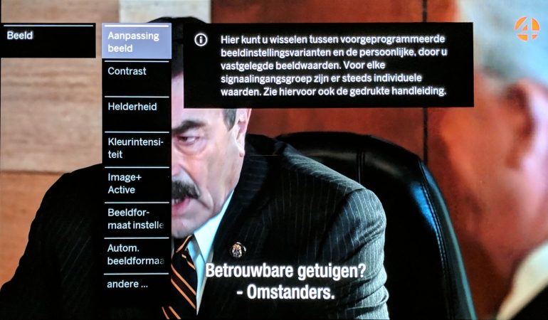 Loewe’s instellingen pas je op twee manieren aan. Wie op de menu toets drukt, krijgt afhankelijk van welke bron je bekijkt/beluistert een specifiek menu aan de rechterzijde van het scherm. Onder andere beeld- en geluidsinstellingen kan je vaak aanpassen via deze weg. Wil je de volledige menu’s dan ga je onderaan in dat optiemenu naar ‘Verdere instellingen’. Of je kan er in een stap naartoe door de menu toets lang ingedrukt te houden.
