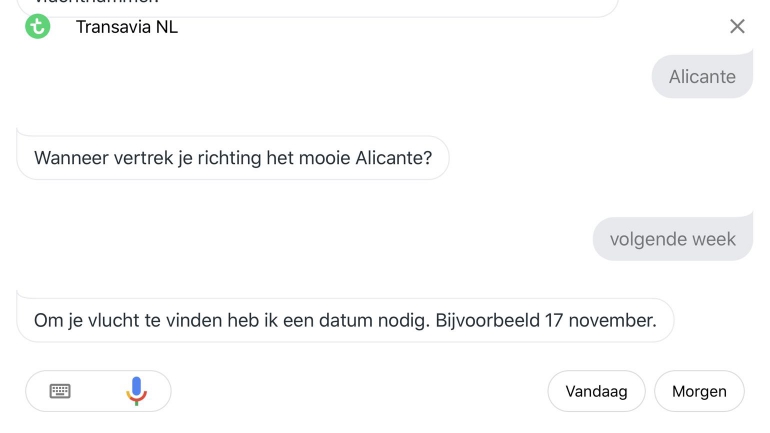 Ben je op zoek naar een vliegreis of wil je de status van je vlucht horen? Dan kun je praten met onder andere KLM en Transavia. Begin met “Praat met KLM/Transavia NL”, waarna het gesprek opgestart wordt. Vervolgens kun je KLM de volgende opdrachten geven: “Ik wil naar New York (of een andere plek)”, “Zoek een ticket naar Londen (of een andere plek) voor 8 mei (of een andere datum).” Transavia vraagt je meteen om een bestemming en kan middels jouw antwoorden op gestelde vragen zaken als de vertrektijd en de vluchtstatus voorlezen. Daarnaast kun je praten met de ANWB, waarna het laatste verkeersbericht afgespeeld kan worden.