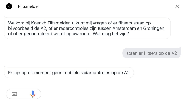 - “Praat met Filtsmelder” en vraag “Staan er flitsers op de A2 (of een andere plek)?” of “Wordt er gecontroleerd op mijn route?”