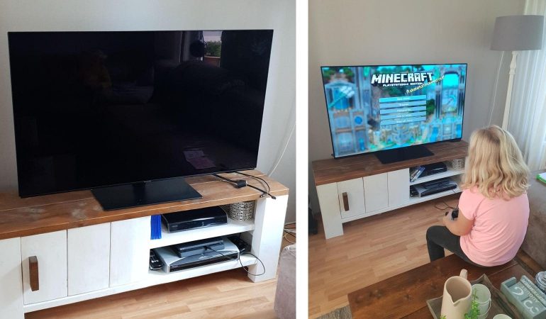 We hebben erg uitgekeken naar dit onderdeel van de test! Gamen is namelijk favoriet bij onze dochter en mijn man. Op de Playstation 4 hebben ze onder andere Fortnite, Farming Simulator, Minecraft en Spiderman gespeeld. Ook hier valt direct de helderheid van het beeld op. Dit maakt het gamen echt heel aangenaam en eigenlijk nog realistischer. Ook de grootte van het scherm maakt dat het gamen nog veel leuker is! We hebben de games allemaal in game-mode gespeeld maar ook zonder hebben we geen problemen gehad met input-lag.