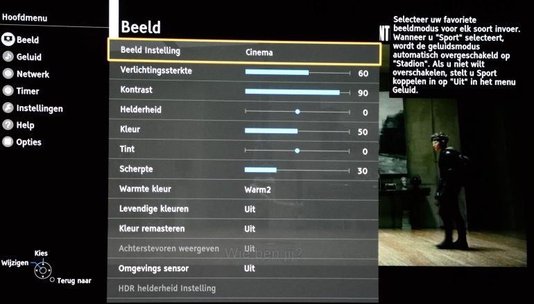 Vaak zijn de instellingen met Cinema en alle varianten erop zoals THX, true of Brightroom grofweg de beste opties. Als je helemaal los wil gaan kun je bij de professionele instelling alles naar je wens afstemmen maar dan moet je wel weten wat je aan het doen bent. Doorloop deze beeldinstelling en kies je favoriet. Zoals ik al verwachtte zijn de instellingen met de ‘Cinema’ varianten zo uit de doos goed. Overdag twijfel ik tussen beeldinstelling Cinema en THX Bright Room. Ik kies in eerste instantie voor Cinema. Bij deze stand zie ik wel dat Intelligent Frame Creation vrij hoog staat, de tijd zal leren of dit voor mij te hinderlijk is, je houdt ervan of je haat het. Deze stand zorgt op mijn led lcd-tv voor ‘soap opera effect’ en beeldfouten bij snelle beweging.
