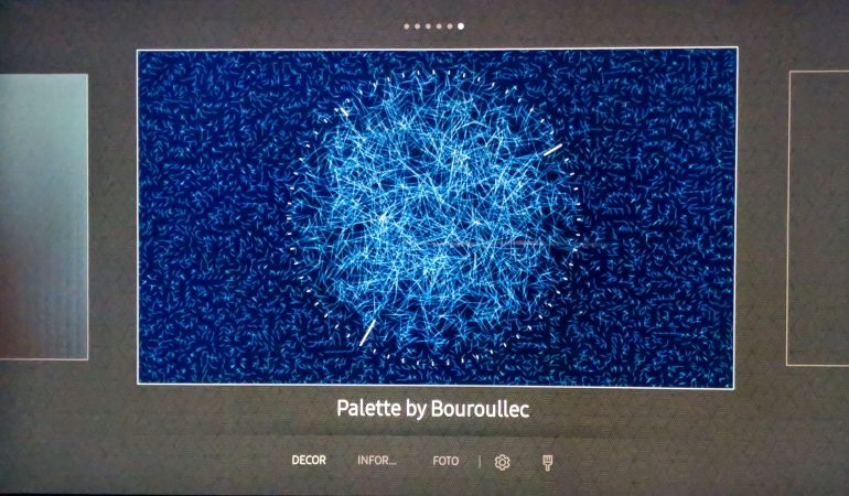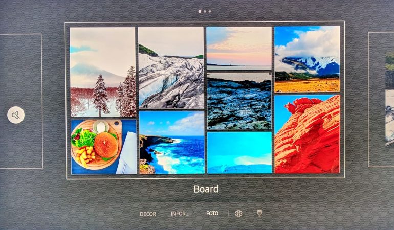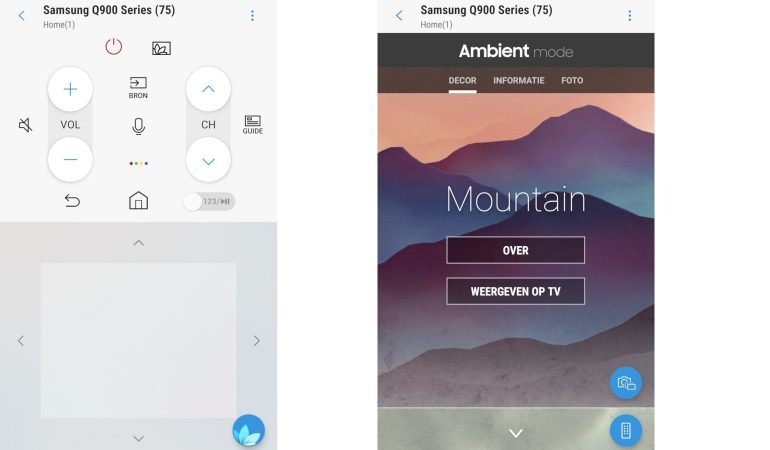 Je kunt kiezen uit een aantal decors, een eenvoudige klok, nieuwberichten of het weer. Natuurlijk kan je ook zelf foto’s aanleveren die je dan in verschilende layouts kunt presenteren. Dat doe je via de Smart Things app op je smartphone (klik in de afstandsbediening op de ambient mode toets rechts onderaan in beeld).