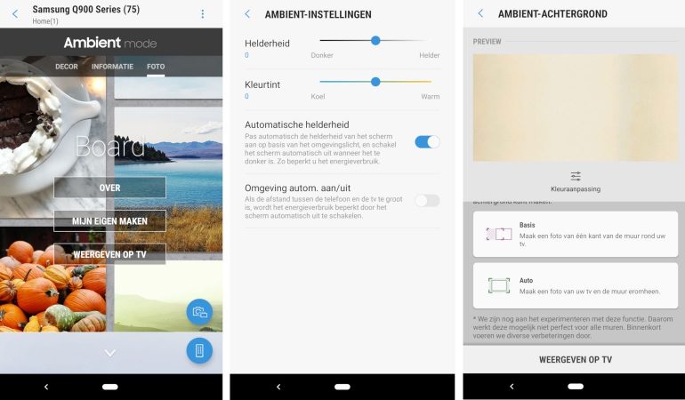 Tot slot kan je ook de achtergrond van Ambient mode aanpassen. Kies een andere textuur of kleur, maar nog leuker, je kunt de tv ook laten opgaan in de achtergrond van de achterliggende muur. Daarvoor open je de SmartThings app, en kijk je bij de instellingen naar de ‘Ambient achtergrond’. Klik onderaan op de ‘basis’ of ‘auto’ toets om een foto te maken van de tv met de achterliggende muur in beeld. De tv probeert zich dan zo goed mogelijk te vermommen en lijkt op die manier een beetje transparant te zijn. Succes hangt uiteraard wat af van hoe complex de omgeving achter de tv er uit ziet.