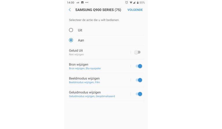 Wil je je smartphone als remote gebruiken, installeer dan de Samsung Smart Things app. De mogelijkheden zijn echter beperkt tot een eenvoudige afstandsbediening. Ook Ambient mode (zie verder) kan je hier configureren.