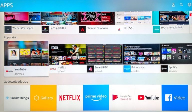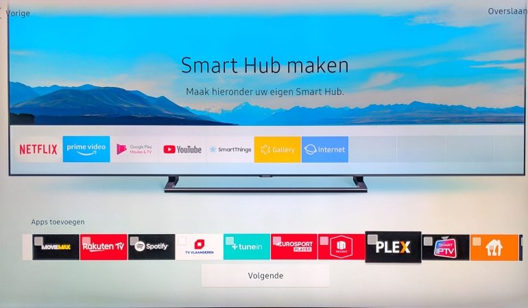 Vervolgens bepaal je de instellingen voor de interne tv-tuners, netwerkaansluiting, en vink je de nodige privacywaarschuwingen en toestemmingen aan. Tot slot kan je optioneel een Samsung-account toevoegen (voor betalende content in de app-store), postcode (voor de elektronische gids) en een aantal bijkomende apps kiezen die op het startscherm moeten verschijnen. Bijkomende apps kan je uiteraard ook achteraf toevoegen.