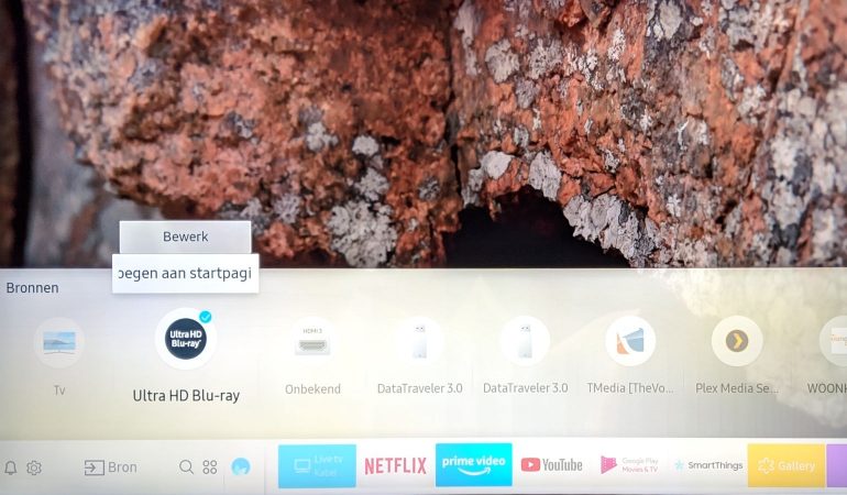 Je kunt ook bronnen toevoegen aan het startscherm. Selecteer het icoon voor de ingangen, en kies de gewenste bron, klik vervolgens op het pijltje naar omhoog (d-pad bovenaan), en je krijgt de volgende opties te zien: toevoegen aan startpagina, bewerk. Via de bewerk optie kan je het icoon en de naam van de ingang aanpassen.