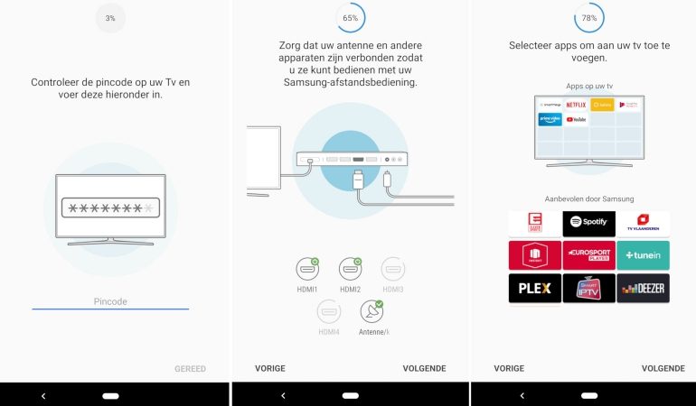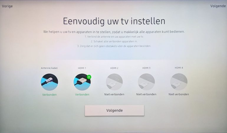 Welke van beide je kiest maakt weinig uit, het proces doorloopt dezelfde stappen. Je kiest taal, land, en een pincode. In een volgende stap probeert de tv alle aangesloten apparaten te herkennen, om zo universele bediening aan te kunnen bieden. Dit kan je ook achteraf instellen.