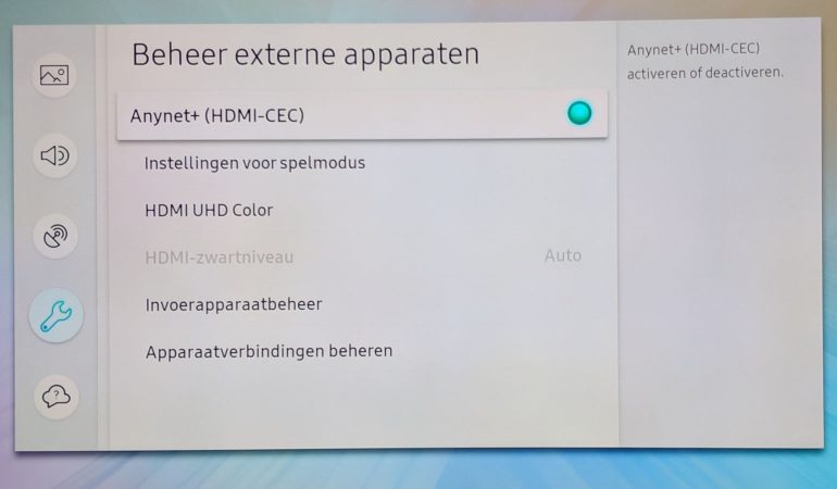 - ‘Beheer Externe Apparaten’: Hier vind je de opties terug om HDMI-CEC in te schakelen (Anynet+), en de spelmodus.